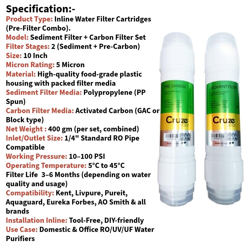 - Dual Filtration Combo: Includes 1 Sediment Filter (removes dirt, rust, sand) and 1 Pre Carbon Filter (absorbs chlorine, bad odor, color, and organic contaminants).